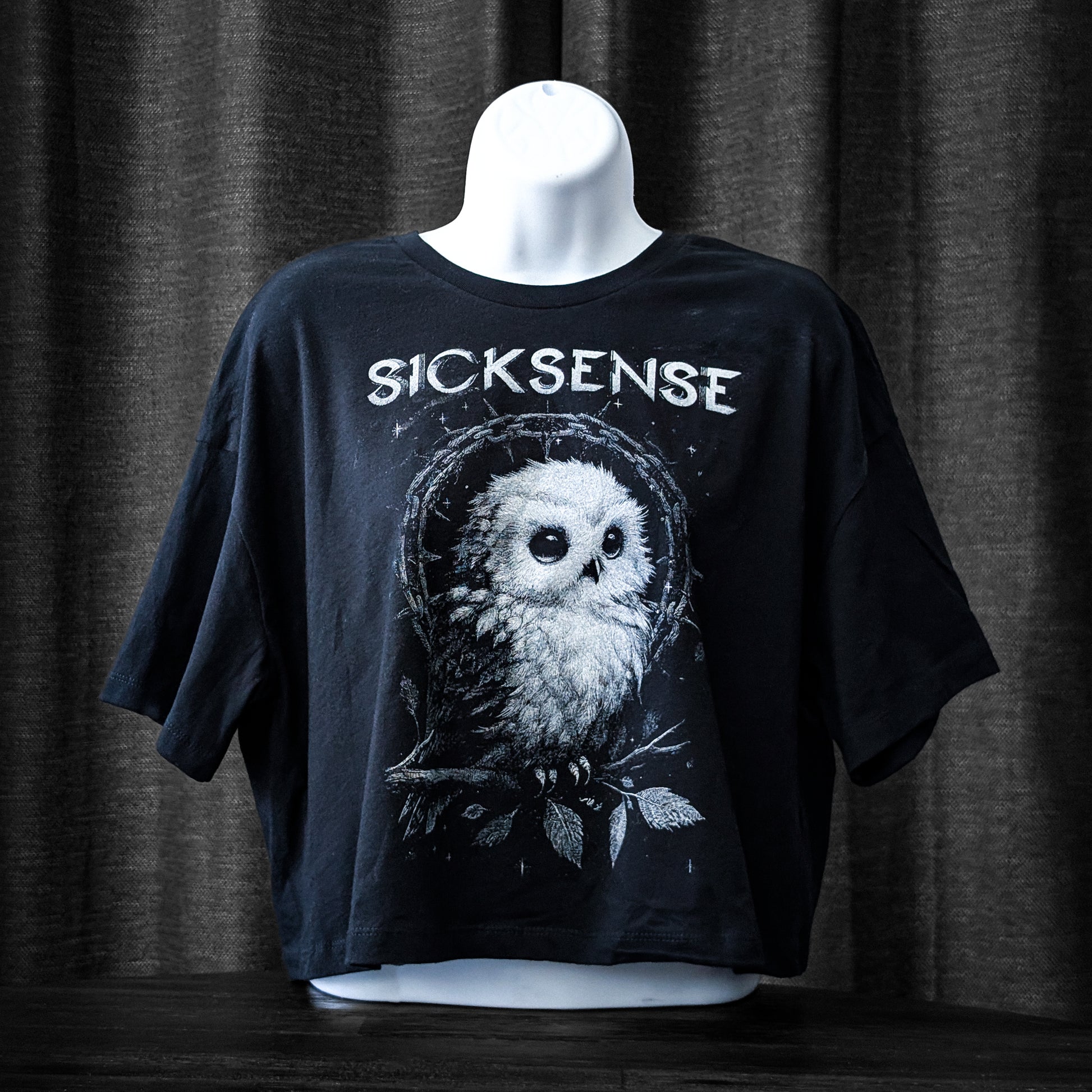 Sicksense "Owl" women's boxy crop top. Silver artwork on 100% cotton black t-shirt.
